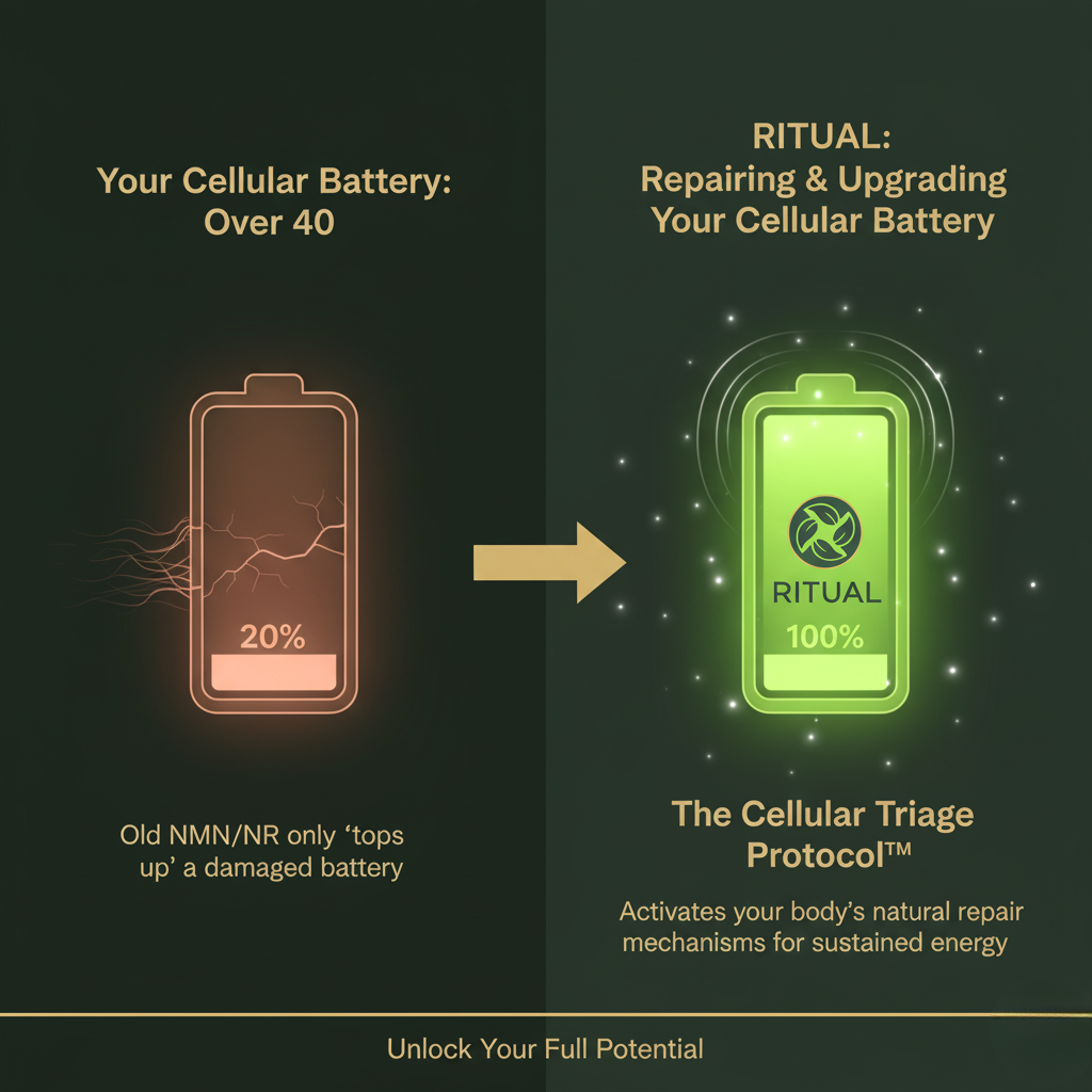 Most NMN/NR formulas only try to 'top up' a damaged cellular battery. RITUAL's 3-Stage Protocol is designed to repair and upgrade it, activating your body's natural mechanisms for sustained energy.