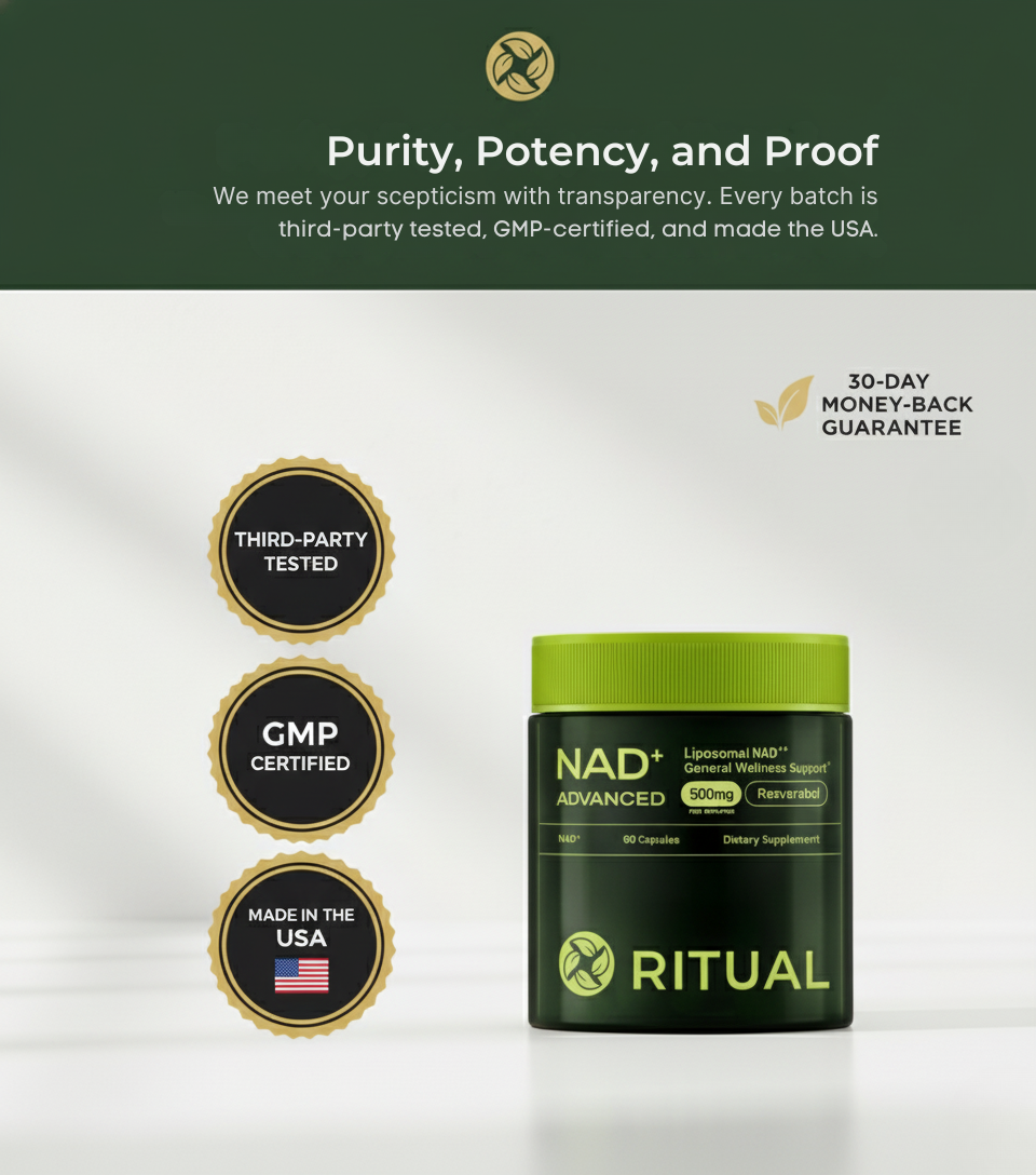 In a market filled with skepticism and "expensive placebos," we meet your distrust with transparency. Trust is the most valuable currency, and "snake oil" is the greatest fear. That is why every batch of NAD+ Advanced is verified by independent, third-party labs for purity and potency. It is produced in a GMP-Certified facility and is proudly made in the USA. No hype, just verifiable proof.