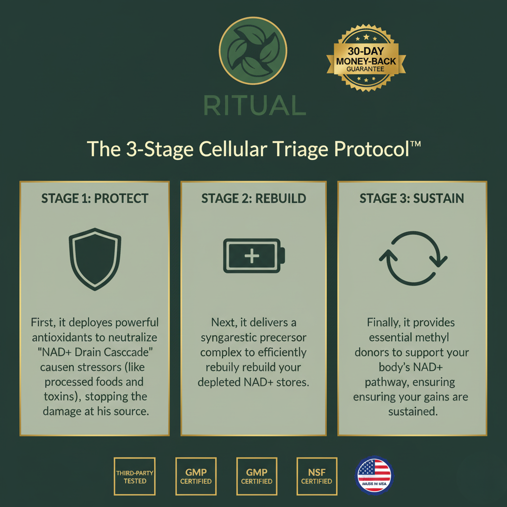 Other supplements fail because they are an incomplete solution. RITUAL is the only formula designed to work like a cellular emergency response team, addressing the cause of NAD+ decline in three distinct stages: